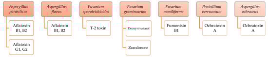 Mycotoxins are defined as secondary metabolites of some fungi species. They are present in agricultural commodities and are produced by certain fungi with adverse acute and chronic effects such as genotoxicity and carcinogenicity on humans and animals [1,2]. The name “mycotoxin” is derived from the Greek word mycos (fungi) and Latin toxicum (poison). They are most often produced by fungi of the genera Aspergillus, Penicillium, Fusarium, and Alternaria [3] (Figure 1). Their synthesis depends largely on the internal parameters of fungal strains (physiological, genetic, and biochemical) [4] but also external factors such as temperature and humidity [5]. This means that the level of mold contamination depends, inter alia, on local weather conditions because high air humidity is conducive to their formation. Most often, mycotoxins are a contamination of plant-based products such as cereals, vegetables, dried fruit, nuts, coffee, cocoa, and tea. They can be present even in wine and beer [6].