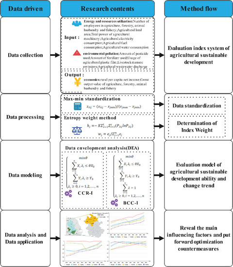 This paper establishes a data-driven method to measure, evaluate, and optimize the capability for sustainable development of agriculture. In terms of data collection, the evaluation index system is constructed by taking the agricultural resource utilization index and environmental pollution index as input indices, and farmers’ income and total output of agriculture, forestry, animal husbandry, and fishery as output indices. In the data processing, the data standardization method and entropy weight method are used to further process and integrate the data. A data envelopment analysis model with constant return to scale and a data envelopment analysis model with variable return to scale are constructed. The quantitative evaluation of the ability for agricultural sustainable development and changing trend was realized. Based on the evaluation results, the main factors influencing the ability of agricultural sustainable development were analyzed, and then the targeted methods to improve the ability for agricultural sustainable development were put forward. The method flow is shown in Figure 1.