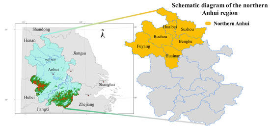 North Anhui is located in the north of Anhui, China, bordering Jiangsu in the east, southern Anhui in the south, Henan in the west, and Shandong in the north. The terrain is mainly plains, including the vast Huaibei Plain. Northern Anhui is an important traditional grain-producing area in China. Cities in northern Anhui include: Bengbu, Bozhou, Fuyang, Huaibei, Suzhou, and Huainan, and their locations are shown in Figure 2. It is of great significance to study the capacity for the development of sustainable agriculture in cities in northern Anhui, summarize the laws of agricultural development and the experience of agricultural development in advantageous areas, and identify the shortcomings of agricultural development in areas with weak agricultural production, to effectively allocate agricultural development resources and promote the improvement of capacity for agricultural sustainable development in northern Anhui.