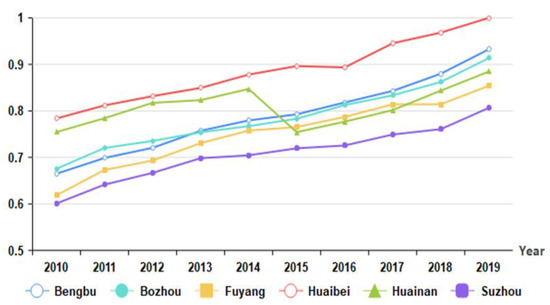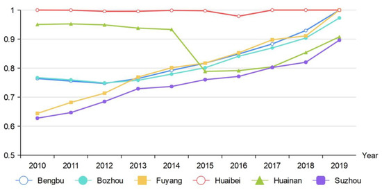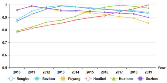 It can be seen from Figure 3 that the overall capacity for sustainable development of each city shows a trend of continuous improvement, which indicates that each city is paying more and more attention to the sustainable development of agriculture, continuously adjusting the industrial structure, improving the technical level of agricultural production, and continuously reducing the input of environment and resources and improving the output. Among cities from 2010 to 2019, only Huaibei, in 2019, has an evaluation result of 1, which is DEA effective; in other years, the cities did not achieve DEA efficiency, suggesting that the agricultural sustainable development capacity of cities in northern Anhui was still weak as a whole, and there was still room for further optimization.