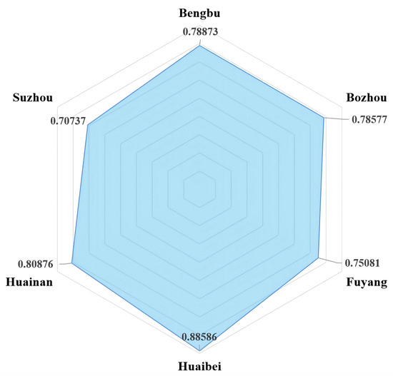 During the timeframe of 2010–2019, except for Huainan, the overall agricultural sustainable development capacity of six cities in northern Anhui showed a steady upward trend, but lower than the previous level observed in the period 2015–2018. During this period, the capacity for agricultural sustainable development gradually improved and recovered to a level exceeding that from 2014 to 2019. This study specifically discusses the causes of the fluctuations in Section 3.3. In comparing the six cities, Huaibei City has the best sustainable development ability (0.886), while Suzhou City has the weakest sustainable development ability, which is only 0.707.