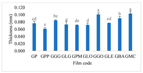 Thickness of studied edible films incorporating essential oils and plant extracts. Data are means ± standard deviations. Data of each column not sharing similar letters are significantly different, at p < 0.05.