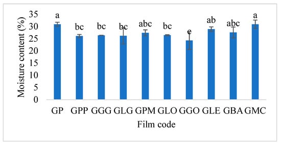 Moisture content of studied edible films incorporating essential oils and plant extracts. Data are means ± standard deviations. Data of each column not sharing similar letters are significantly different, at p < 0.05.