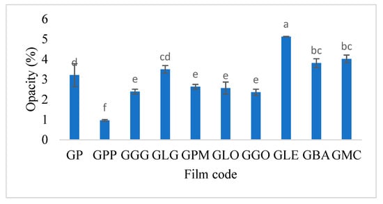 Opacity of studied edible films incorporating essential oils and plant extracts. Data are means ± standard deviations. Data of each column not sharing similar letters are significantly different at p < 0.05.