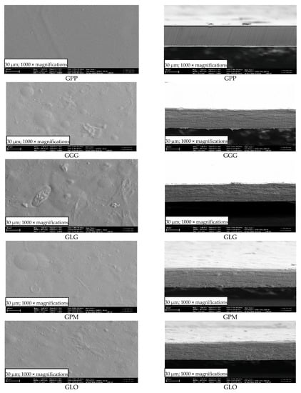 Scanning electron micrographs of film surfaces and cross-sections are shown in Figure 4. The results suggest that the GPP film had the smoothest and most homogeneous surface and cross-section microstructure. The smooth and homogeneous surface and cross-section microstructure can be explained by a well-ordered matrix between alginate, carrageenan and gac pulp pectin [39]. Overall, micrographs of GP films and other incorporated films also suggest a heterogeneous microstructure that correlates with the lower transparency of these films. The results also indicate that there were more convex irregularities on the surface of the oil-added films than the GP film. A previous study reported by [61] observed that incorporation of the essential oils and plant extracts could result in variation of structures due to the arrangement of film-forming polysaccharides and aggregation of oils and extracts during film production. It should be noted that the films incorporated with essential oils had more homogenous surfaces than that of the films incorporated with the plant extracts (Figure 4). In addition, the results also revealed that all the films had a fibrous-like structure, which concurs with previous studies on semi-refined kappa-carrageenan edible films [62] and alginate/ginseng films [59].