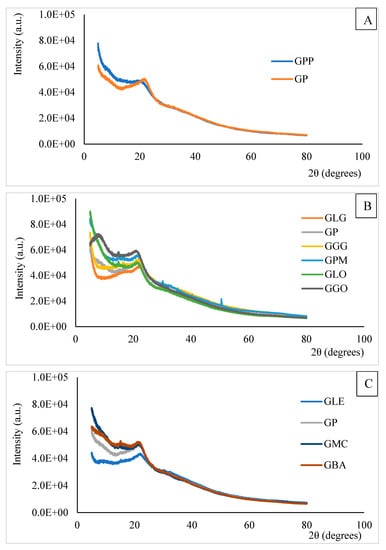 XRD patterns of control GP film and GPP film (A); of control GP film and films incorporated with plant oils (B); of control GP film and films incorporated with plant extracts (C).