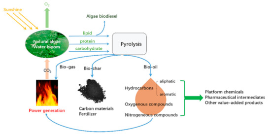32. Hu, Z.; Zheng, Y.; Yan, F.; Xiao, B.; Liu, S. Bio-oil production through pyrolysis of blue-green algae blooms (BGAB): Product distribution and bio-oil characterization. Energy 2013, 52, 119–125. [Google Scholar] [CrossRef]