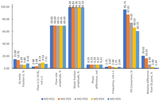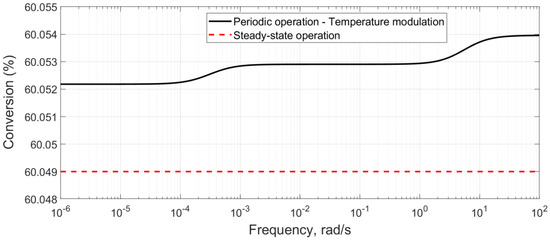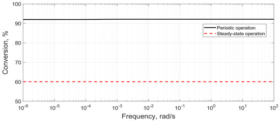 The performance indicator that can best express the efficiency of the investigated periodic operations is the acid conversion. For the forced periodic modulation, the conversion needs to be evaluated based on the mean (time-averaged) values of the outlet and inlet molar flowrates of formic acid, corresponding to the periodic steady state [21,24,25]