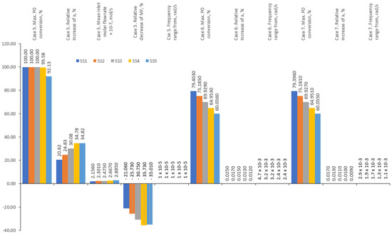 Equation (36) forms the basis for the nonlinear FRF method for fast evaluation of periodic operations with single input modulations. The function is the so-called asymmetrical second order (ASO) FRF relating to input x and output y. This function can be derived from the nonlinear reactor model using a procedure described in [14,21,22]. The sign of the ASO function gives an answer as to whether periodic modulation can overperform SS operation. The magnitude of the possible improvement is proportional for the square of the input amplitude and can be estimated by Equation (37).