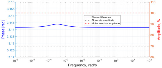 Based on the reactor model (Section 3), six outputs can be defined: (i–iv) the molar fractions of four components (formic acid, nitrogen, hydrogen and carbon dioxide) in the reactor, (v) the formic acid coverage and (vi) the outlet flowrate. However, as the photocatalytic step (Equations (2) and (3)) is irreversible, there is no need to evaluate the molar fractions of the products as they have no influence on the dynamics of the system. Therefore, the dynamic model can be reduced to three coupled equations (Equations (26), (27) and (32)) that allow us to evaluate the acid conversion, the acid molar fraction and the outlet flowrate. Thus, the other three outputs can be omitted from the analysis.