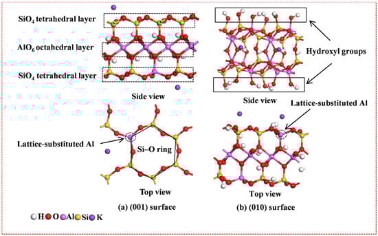 Figure 1 shows the surface models of illite. One Si in the Si–O ring is replaced with Al, and the compensating ion (K+) is adsorbed above the Si–O ring on the (001) surface (Figure 1a). Si atoms exposed on the (010) surface coordinate with OH to form ≡Si–OH, and Al atoms coordinate with OH to form ≡Al–OH or ≡Al–(OH)(OH2) (Figure 1b) [16]. The Al atom was chosen to coordinate with OH to form ≡Al–OH on the (010) surface in the model. The illite (001) and (010) surface models were constructed with 82 and 94 atoms, respectively.