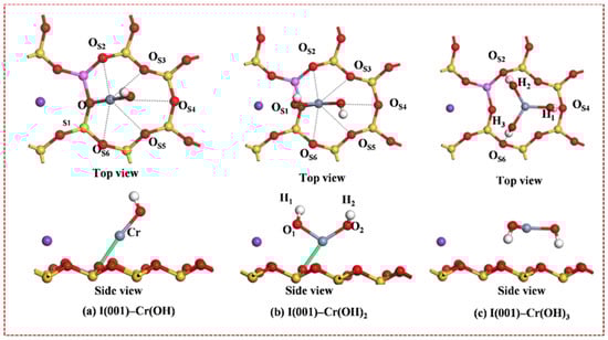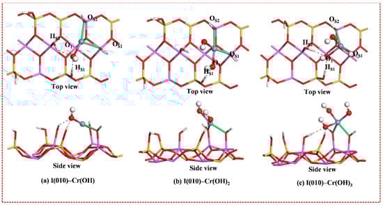 The DFT-simulated optimal adsorption configurations of Cr(OH)2+, Cr(OH)2+, and Cr(OH)3 on the illite (001) surface are shown in Figure 2, with the calculated energy characteristics and structural parameters listed in Table 1. The adsorption energies of Cr(OH)2+, Cr(OH)2+, and Cr(OH)3 on the illite (001) surface are −235.78, −128.36, and −78.89 kJ/mol, respectively. In contrast, the adsorption energies of water molecules on the illite (001) surface vary from −48 to 57.6 kJ/mol [22]. Therefore, we can infer that Cr(OH)n(3−n)+ displaces water molecules to adsorb preferentially on the (001) surface. The adsorption energy of Cr(OH)n(3−n)+ on the (001) surface decreases with an increasing number of hydroxyl groups. However, further analyses of the adsorption configurations are required to understand the origin of this change in adsorption energy.