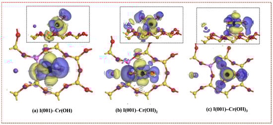 The Si–O ring on the illite (001) surface, which has a low electrostatic potential energy and is strongly electronegative, can trap cations. The charge distributions in the stable adsorption configurations of Cr(OH)n(3−n)+ on the (001) surface can be obtained by analyzing electron density differences. To ensure the feasibility and validity of the DFT method, initial configurations of Cr(OH)n(3−n)+ and uncharged illite surfaces were simulated [28,29,30]. Figure 4 shows the differences in electron density for Cr(OH)2+, Cr(OH)2+, and Cr(OH)3 adsorbed on the illite (001) surface. Electron density overlap between Cr and OS1 in the I(001)–Cr(OH), and I(001)–Cr(OH)2 configurations is observed. This is due to the existence of covalent bonds and is in accordance with the previous results. Both Cr and OSn (n = 2–6) show accumulation and loss of charge, indicative of an electron transfer between them. In addition, charge accumulation and loss between OS1 from Cr(OH)2+ and the equilibrium K ion are observed in the I(001)–Cr(OH)2 configuration, indicative of an electron transfer between Cr(OH)2+ and K. Electron transfer between Cr and OSn (n = 1–6) is observed in the I(001)–Cr(OH)3 configuration, but more electron transfers are observed between OSn (n = 2, 4, and 6) and Hn (n = 1–3) owing to the existence of hydrogen bonds.