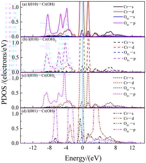 Cr(OH)n(3−n)+ PDOSs of surface OS1 and Cr: (a) I(010)–Cr(OH), (b) I(010)–Cr(OH)2, (c) I(010)–Cr(OH)3, and (d) I(001)–Cr(OH).