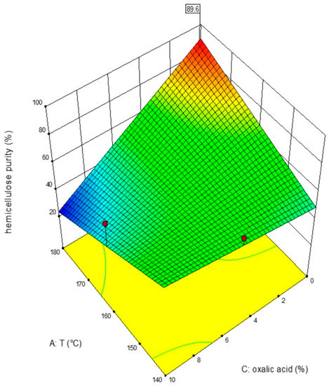 Figure 4. Purity of the CF as a function of temperature and oxalic acid obtained from WS pretreated with butanol, at 60 min. Here and in the following, the surface is the 2-order polynomial best interpolating the experimental data.
