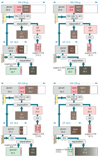 The OS process with butanol was also tested at a relatively low temperature of 140 °C and halved the enzyme loading from 10% to 5% of the CF weight, in order to validate the efficiency of the process while saving thermal energy and enzyme. The results were compared with those obtained at optimized conditions in Figure 10 (see also Supplementary Data, Figures S9 and S10). As expected, we observed a lower yield of glucose at a lower temperature, however, the loss of fractionation efficiency is more marked in the case of ER than in WS. Further, the processes with butanol at 140 °C were still better than those performed with 2M-THF at higher temperatures (175 °C for WS and 170 °C for ER), highlighting the greater importance of solvent choice than the operating conditions.