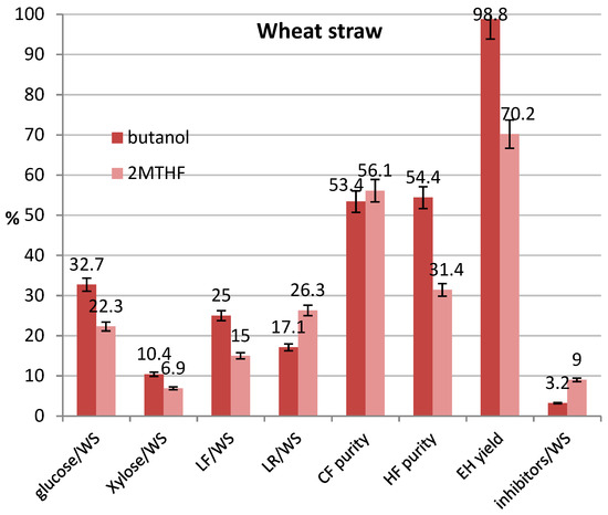 At optimized pretreatment conditions, from 100.0 g of WS, we obtained 32.7 g glucose using butanol and 22.3 g using 2M-THF. In the case of ER with butanol, 33.3 g were recoverable, while only 11.5 g were obtained with 2M-THF. Furthermore, with butanol about 14 g of pentoses can be separated in the aqueous phase compared to only 6–9 g with 2M-THF. The extracted organosolv lignin was higher using butanol compared to 2M-THF and, generally, each fraction was significantly purer in the butanol process. The system WS and butanol represented the best combination also regarding the production of inhibitors (acetic acid, formic acid, furfural, 5HMF) and in optimized conditions, accounted for 3.21 g, versus the larger production of 9.49 g measured in the case of ER/2M-THF.