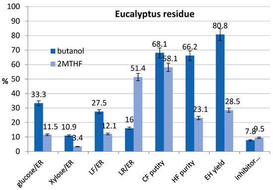 Confirmation tests were performed using the optimized conditions reported in Table 5 and the mass flow and the recovery of the main constituents in the different steps of the process were determined from experimental data. The results are summarized in Figure 7 assuming a basis of 100 g of dry biomass. The results were in the confidence range predicted by the model. In Figure 7, we reported the results obtained treating the ER with 2M-THF at the same condition of ER treated with butanol, to observe the only effect of substituting the organic solvent.