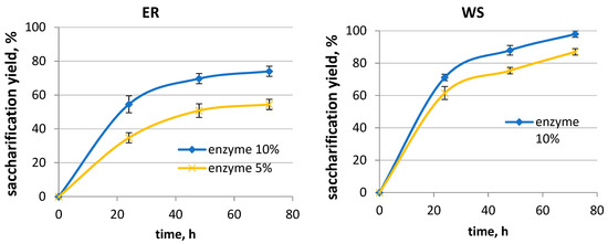 Figure 10. Enzymatic hydrolysis yields of the CF from ER (left) and WS (right) at different enzyme dosages.