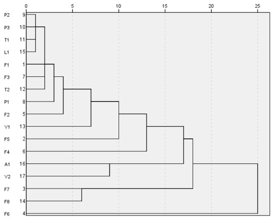 The variables are clustered by R-type, and the distance between clusters is between-groups linkage distance. The clustering results are shown in Figure 5.
