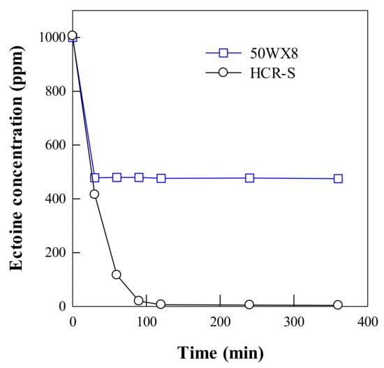 Ectoine ((S)-2-methyl-1, 4, 5, 6-tetra-hydropyrimidine-4-carboxylic acid, CAS 96702-03-3, >95%) was purchased from Sigma-Aldrich, Munich, Germany; it was produced by the natural Gram-negative bacteria Halomonas elongate. Dowex® HCR-S is a strong acid, styrene-divinylbenzene cation-exchange resin (CAS 64082-73-1, mesh size: 20–50 mesh, ionic form: H, moisture: 50–56%, capacity: 4.8 meq/g, Sigma-Aldrich, Munich, Germany). Dowex®50WX8 is a strong acid, styrene-divinylbenzene cation-exchange resin (CAS 69011-22-9, mesh size: 100–200 mesh, ionic form: Na, moisture: 54%, capacity: 4.8 meq/g, Sigma-Aldrich, Munich, Germany). HCl (35%) and NaOH (97%) were purchased from SHOWA (Tokyo, Japan). NaCl (99.8%) was purchased from Sigma-Aldrich (Munich, Germany). The water was deionized. All reagents were used as received, except for the resin.