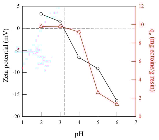 The solution’s pH value is crucial to adsorption, especially for ion exchangers. Ectoine is a Zwitterion compound and can transform between cationic and anionic forms based on the pH, as shown in Figure 2. A zwitterion, also called an inner salt, contains an equal number of positively and negatively charged functional groups. Therefore, zwitterions are mostly electrically neutral; the whole molecule’s net charge is zero. The isoelectric point is derived from its inner-salt structure. Hence, the pH can affect the adsorption capacity by changing the property of adsorbent and solution analytes. In this work, the initial pH of the solution was adjusted using HCl and NaOH, with and without the ion-exchange resin. Table 2 shows that the initial pH of the solution without ion-exchange resin does not affect the equilibrium adsorption capacity (qe) of ectoine (mean = 9.83 mg/g). This demonstrates that the surface charge of both the exchanger and analyte is not affected by the surrounding pH, but the concentration gradient of H+ inside the resin overwhelmed the solution’s pH. The acidity of Dowex® HCR-S itself was pH 3.3 when 1 g of dry resin was immersed in 10 mL of neutral water. This demonstrates no effect on ectoine adsorption from adjusting the initial pH in the solution without resin. Therefore, we determined we should adjust the pH in the solution with resin before the experiment.