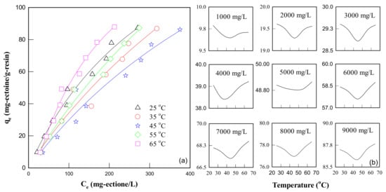 Saturation experiments were carried out to confirm the maximum ectoine loaded in the cation-exchange resin and for further the desorption investigation. According to the isotherm results in Section 4.1.5, the predicted saturation capacities of ectoine on Dowex® HCR-S were 0.22–0.67 and 0.20–0.36 (g/g) based on the nonlinear Langmuir maximum adsorption capacity in Table 3, respectively. Therefore, the experiments were performed by mixing 0.5 g resin with 2 mL solution of ectoine, with the concentrations set as 0.12, 0.125, 0.135, 0.15, 0.17, and 0.20 g/mL. As shown in Figure 9a, there was no significant effect of initial concentration on ectoine saturation at 25 °C, and the adsorption capacity ranged from 0.55 to 0.60 (g/g). Therefore, the adsorption capacity can be confirmed as the saturation capacity (qsat) since no more ectoine could be loaded with the amplification of the concentration gradient. Based on the results in Section 4.1.5, the mechanism of ectoine adsorption is not a pure ion exchange but a mixture of ion exchange, electrostatic force, and physisorption (van der Waals force). The Langmuir isotherm assumes adsorption occurs under a homogeneous system with monolayer adsorption, and thus, the predicted maximum adsorption lacks multilayer adsorption based on the Freundlich theory. Multilayer adsorption can be attributed to physisorption (van der Waals), with ectoine stacked on the first layer sorption (ion exchange). The conclusion that the Sips isotherm, also known as the Langmuir–Freundlich model, can describe the ectoine adsorption by using Dowex® HCR-S shows that the experimental saturation capacity is larger than the Langmuir adsorption capacity. According to Figure 9b, the effect of temperature on ectoine saturation is not significant either, which means ectoine adsorption is not dependent on temperature.