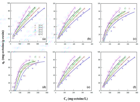 Batch adsorption experiments were conducted by mixing the ion-exchange resin (1 g) and ectoine solution (10 mL) in a 30 mL flask. The desired concentration of ectoine solution (1000 mg/L) was prepared by diluting from the stock solution in a 30 mL sample bottle. The concentration of the stock solution was 10,000 mg/L. The solution was agitated at 100 rpm at a selected temperature from 25 °C to 65 °C in a reciprocating water bath shaker (DK W-20, DENG YNG, Taipei, Taiwan). The mixture was shaken at a selected contact time, varying from 0.5 to 6 h for the kinetic experiment and 8 h for the equilibrium isotherm experiment. After adsorption, the samples were filtered through a polyvinylidene difluoride (PVDF) filter with a pore size of 0.45 μm. The residual concentration of ectoine in the filtrate was determined using HPLC with a wavelength of 210 nm.
