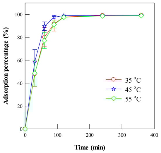 Resin (1 g) was added to a 10 mL ectoine solution (1000 mg/L) and agitated at 100 rpm at 35 °C in a reciprocating water bath shaker. The adsorbed rate of ectoine was investigated by measuring the ectoine ion concentration at predetermined time intervals using the HPLC method. The amount of adsorbed ectoine ions qt (mg/g) at time t (min) was calculated using Equation (4):