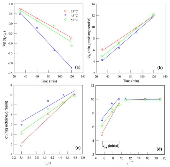Ion exchange and adsorption share various standard features regarding application of the batch and fixed-bed processes, which can be grouped as sorption for a unified treatment. These processes involve the transfer and equilibrium distribution of one or more solutes between a fluid phase and particles [14]. Adsorption kinetics are based on the relationship between the adsorbate–adsorbent and the reactor’s operation in the adsorption reaction, which plays a vital role in designing the plant column. Common adsorption kinetic equations are the pseudo-first-order model, pseudo-second-order model, and intraparticle diffusion model.