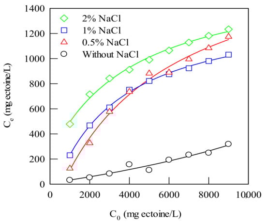 Ectoine is produced using fermentation from halophilic and halotolerant bacteria; thus, salts, such as NaCl, occur in the ocean. While the liquid was maintained at a neutral pH, salt was dissolved in the ectoine solution at different concentrations to study ectoine adsorption with ion-exchange resin. Furthermore, the desorption was conducted after capturing ectoine with an ion-exchange resin. Figure 8 shows that the ectoine residual concentration increased with salt in the liquid phase. This shows that ectoine ions compete with sodium ions at the ion-exchange sites.