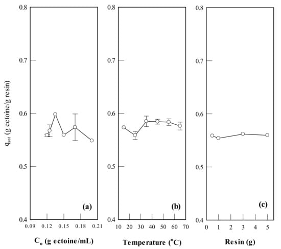 According to Figure 9c, the resin weight did not affect the saturation capacity of ectoine in the ion-exchange resin significantly, and the ectoine-saturated capacity was around 0.56 (g/g) under the same temperature and initial ectoine concentration, which equaled an average of 3.9 (meq/g). The saturation percentage of the resin was 81.8% (=3.9/4.8) based on Dowex® HCR-S’s total exchange capacity of 4.8 (meq/g).