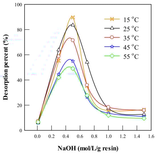 The desorption equilibrium of ectoine released from saturated Dowex® HCR-S resin was found in a batch reactor, as shown in Figure 9. The sequence of temperatures for ectoine desorption was 15 °C 25 °C > 35 °C > 45 °C > 55 °C. The desorption performance was higher at lower temperatures. The desorption of ectoine was greatest at 15 °C, with 89.7% desorption. Theoretically, with a higher NaOH concentration, better desorption results could be obtained and a plateau reached due to the higher driving force provided with larger OH− concentrations. The best desorption performance was found at an NaOH concentration of ≈0.5 mol/L, as shown in Figure 10. Furthermore, the ectoine ions were transferred from the solid to the liquid phase when the eluent solution exchanged the ectoine molecules. This phenomenon is a consequence of mass transfer, which was boosted by the high concentration gradient between resin and solution phases and maximized by the ionic strength of the basic eluent. NaOH solution can promote a very high ectoine removal as a desorbed agent since even the lowest concentrations in the resin phase correspond to high concentrations in the solution, resulting in favorable desorption. When the NaOH concentration is larger than 0.5 mol/L, the desorption percentage of ectoine is decreased (Figure 10). This results from ectoine denaturation under extreme alkaline conditions.