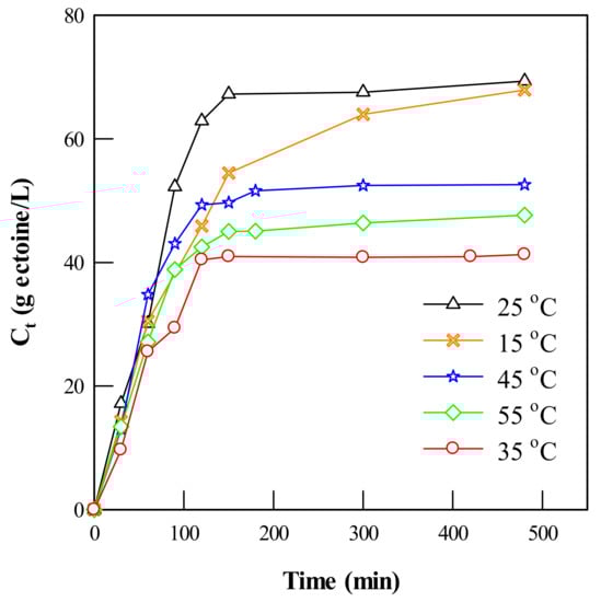The effect of temperature on the equilibrium and the desorption kinetics using NaOH as an adsorbed agent was assessed to study the desorption rate. Figure 11 shows the effect of desorption time on the release of ectoine ions from Dowex® HCR-S resin. Ectoine ions were rapidly released from the acidic cation exchanger before 180 min, followed by slow desorption and equilibrium being attained. Desorption of ectoine ions was found to be proportional to the desorbed time before equilibrium was reached. The sequence of temperatures for ectoine desorption was 25 °C > 15 °C > 45 °C > 55 °C > 35 °C. This shows no trend for the temperature effect. Desorption and ion exchange may simultaneously control the reaction kinetics.