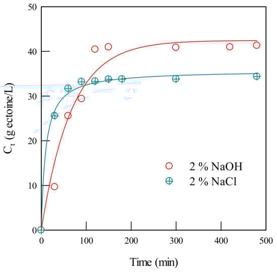 Figure 12 shows that the desorption efficiency when using NaCl (54.5%) was not as high as when using NaOH (78.1%) at 35 °C. The desorption of ectoine showed a higher rate in the first 120 min when using NaCl, based on the mechanism of salt desorption, and a higher equilibrium desorption was obtained by using NaOH, which relies on both pH and salt desorption. Therefore, NaOH promotes stronger desorption of ectoine than NaCl since there are two mechanisms that support using NaOH as a desorption agent.