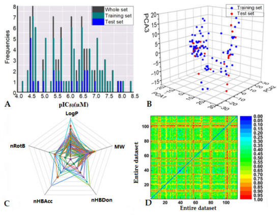 (A) Distributions of the experimental pIC50 values for the whole dataset (n = 115, grey bars), training set (n = 92, green bars), and test set (n = 23, blue bars); (B) Chemical space of the entire dataset (n = 115) using top three principal components of dragon molecular descriptors (57% variance explained). (C) Radar map of molecular properties of the entire dataset; (D) Heat map of molecular similarity constructed by Euclidian distance metrics for the entire dataset.