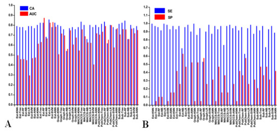 However, their SE values and SP values were in the range of 0.88 to 0.99 and 0 to 0.53, respectively, which means that these models had a good predictive ability for the active inhibitors other than the inactive inhibitors. It may be speculated that the higher ratio of active inhibitors to inactive inhibitors in the data set was the underlying reason.