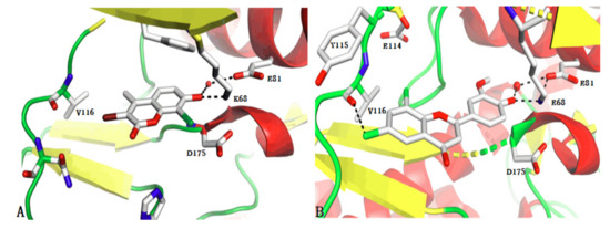 In order to elucidate the roles of privileged substructures binding to CK2, molecular docking was performed to identify the potential position and orientation of compounds 2 and 73 in the active pocket using Genetic Optimization for Ligand Docking (GOLD) version 4.0 [43]. The active site of CK2 was defined as the collection of amino acids enclosed within a 6.5 Å radius sphere centered on Ellagic [44]. TheGOLD score and default genetic algorithm (GA) parameters were applied to predict the binding modes between CK2 and inhibitors.