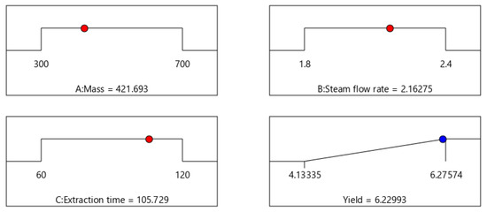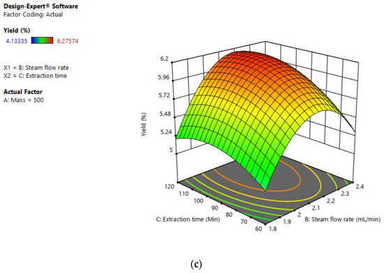 | A: Mass (g) | B: Steam Flow Rate (mL/min) | C: Extraction Time (min) | Actual | Residual | ||