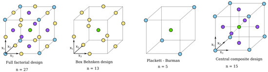 Figure 4 plots and compares the sampling strategy of the applied DOE methodologies, Full Factorial, Box-Behnken, Plackett-Burman, and Central Composite Design. These methodologies are illustrated in a three level design space , in the case of parameters. It can be seen from the figure, that in the case of a full factorial design, for all of the sampling points, 27 simulation should be done, while in the case of a Box-Behnken design only 13 variables should be considered. If the number of the parameters (n) increases, these sampling strategies are becoming more and more efficient. However, neglecting a large amount of sampling points leads to the loss of calculation accuracy. If the computational time is not critical, the full-factorial solution gives the most accurate solution. In the rest of the paper, the full factorial design is calculated to be used as a reference to compare the different methodologies with that.