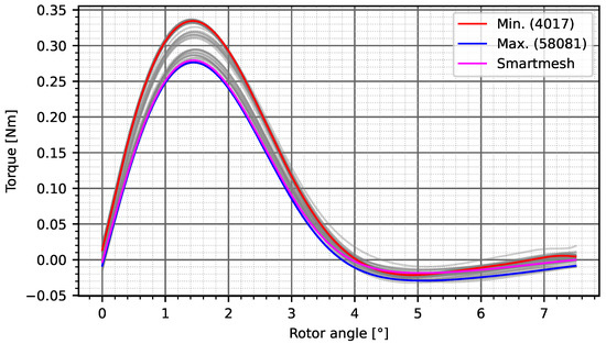 Cogging torque in relation to different mesh settings. The labels show the total number of elements in a particular configuration. In magenta, the smart mesh option was turned on.
