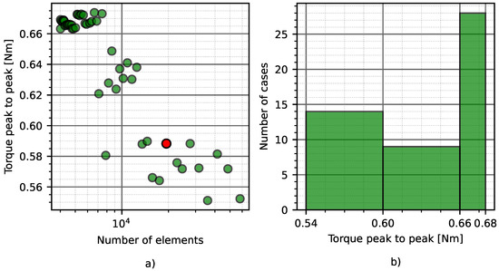 The peak cogging torque in relation to the number of elements. (a) The peak cogging torque in each simulation, (b) the distribution of the results.