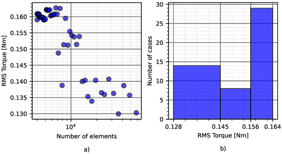 The root mean square torque in relation to the number of elements. (a) The RMS torque in each simulation, (b) the distribution of the results.