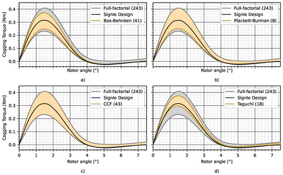 The mean value of the calculated cogging torque and its tolerances with different DoE strategies: Full-facorial designs represented by the gray zone and its results compared by Box-Behnken design (a), Plackett-Burman (b), CCF (c) and Taguchi design (d).