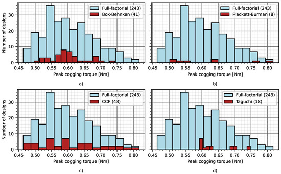 The distribution of the peak value of the cogging torque with the different Doe strategies: Box-Behnken (a), Plackett-Burman (b), CCF (c), and Taguchi (d), which were compared with the Full-factorial design.