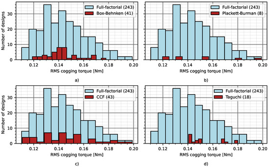 The distribution of the calculated rms value of the cogging torque with the different Doe strategies: Box-Behnken (a), Plackett-Burman (b), CCF (c), and Taguchi (d), which were compared with the Full-factorial design.