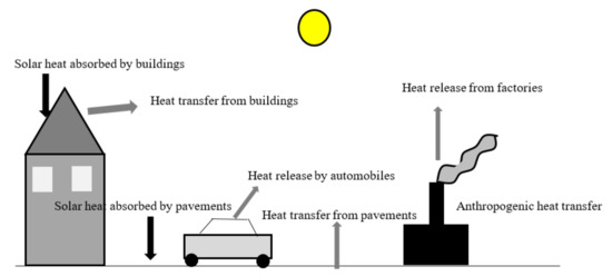 Figure 1 shows how a UHI occurs in a city. Solar heat during the day is absorbed by various urban surfaces such as the roofs of buildings and pavements. Heat is transferred back into the atmosphere from these surfaces. The air nearer to the surfaces on earth are warmer due to heat transfer. Heat is also released from factories, automobiles, and other anthropogenic sources.