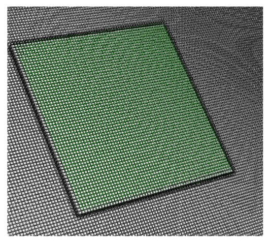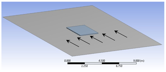 Three-dimensional CFD simulations were performed on pavement blocks made of two different materials—asphalt and concrete. The simulation geometry was based on Asaeda et al.’s 1991 experiments on asphalt and concrete pavement blocks. Similar to the experiments, the pavement structures used in the model were rectangular, having the same dimensions. The structures were 3 m in length, 3 m in width, and 0.1 m in thickness. The experiments were performed in an open space. The wind velocity and ambient temperature were measured 1.5 m above the ground [19]. Inside pavement samples, 1-mm-diameter copper tubes were installed along the central axis at depths of 0.025 m, 0.05 m, and 0.1 m. Temperatures were measured by inserting thermocouples into the tubes [19]. Figure 2 shows the simulation geometry with the pavement block located in the center. The arrows show the direction of wind flow. In order for the pavement to be located in an open space, a 15 m long and 15 m wide simulation domain was created with the pavement located at the center. The domain was 1.5 m high based on the wind velocity measurement location given by Asaeda et al.