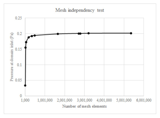 The hexahedral mesh is used and mesh independence is obtained with 2,797,202 elements in the simulation geometry. Figure 3 shows the mesh independency test results based on the calculated pressure at the domain inlet. The result does not change through three decimal places when the number of mesh elements exceeds 2.5 million.