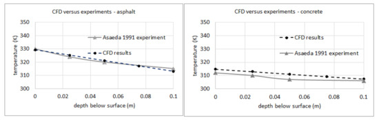 The CFD model was developed based on Asaeda et al.’s experiments on asphalt and concrete pavements performed in Tokyo, Japan (global position: longitude = 139.77°, latitude = 35.67°, time zone = 9) on 26 August 1991 [19]. The experiments were performed on asphalt and concrete pavements measuring each 3 m × 3 m × 0.1 m. Asaeda et al. reported an approximate ambient temperature of 305 K and wind speed of 0.6 m/s. The average wind speed was measured within an altitude of 1.5 m above the ground. The emissivity of both asphalt and concrete pavements was reported as 0.94. They reported a reflectivity of 0.1 for the asphalt pavement and a reflectivity of 0.45 for the concrete pavement. Using CFD, the pavement top surface temperature and the temperatures at depths of 2.5 cm, 5 cm, 7.5 cm, and 10 cm from the pavement top surface were calculated for a known ground temperature for both asphalt and concrete under the above-mentioned conditions at a given time of day (14:00). Figure 5 shows a comparison between the CFD results and the experimental measurements for the asphalt and concrete pavements.